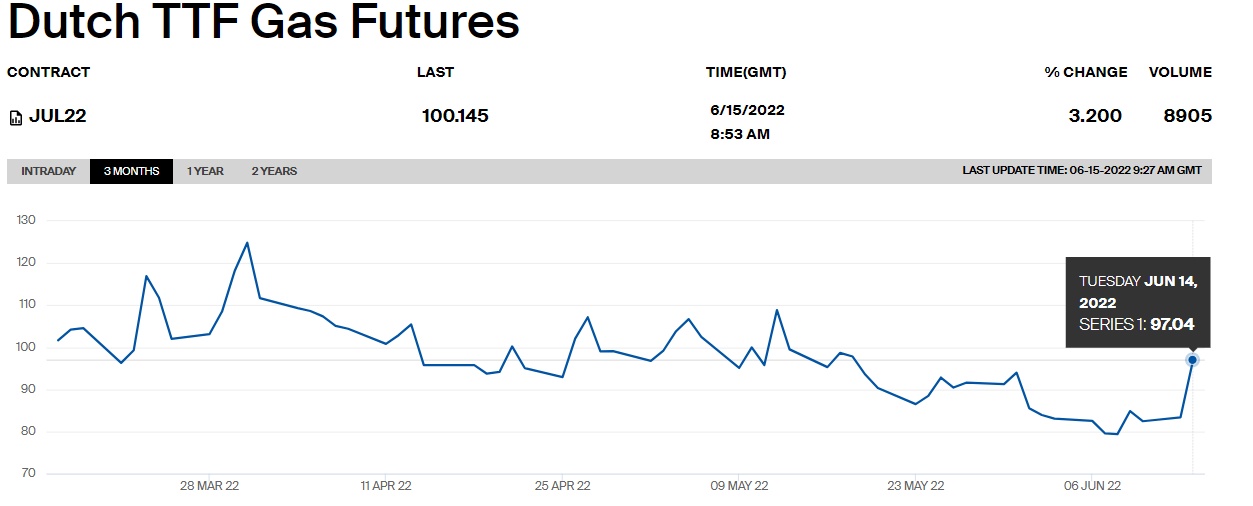 智通财经APP了解到,欧洲天然气价格基准TTF期货指数连涨三日,今日一度涨至每兆瓦时104.64欧元,截至发稿涨3.20%至100.145欧元/兆瓦时,达到一个多月来的最高水平。自5月13日以来,欧洲天然气价格持续下滑,截至6月14日,持续在80-95欧元/兆瓦时水平徘徊。