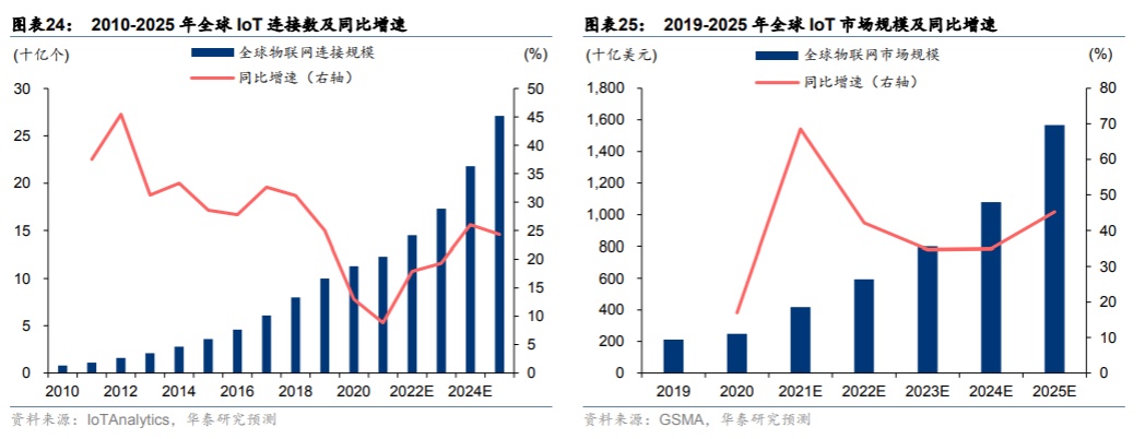 此背景下,物联网连接数稳步增长,网络效应推动物联网价值持续扩张。据IoTAnalytics研究,2020年全球物联网连接数将超113亿个,首次超过非物联网连接数,2010-2020年十年间CAGR达30.3%,2021年至2025年的CAGR预计达21.8%,连接数持续快速增长。
