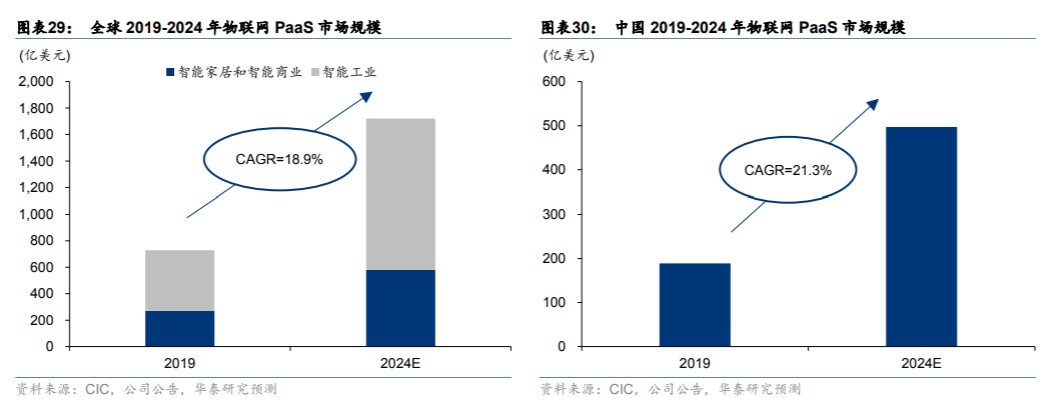 与此同时,随着物联网连接数的持续增长带来海量数据,物联网PaaS行业预计也将快速增长——据CIC预测,2019年全球物联网PaaS行业的市场规模为72.2亿美元,到2024年预计达到171.7亿美元,2019-2024年平均增长率为18.9%。2019年中国PaaS行业的市场规模为189亿美元,预计2024年能达到497亿美元,2019-2024年均增长率为21.3%。