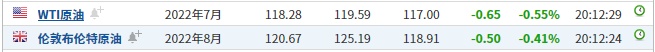 3. 截至发稿,WTI原油跌0.55%,报118.28美元/桶。布伦特原油跌0.41%,报120.67美元/桶。