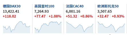 2. 截至发稿,德国DAX指数涨0.96%,英国富时100指数涨1.08%,法国CAC40指数涨0.86%,欧洲斯托克50指数涨0.93%。