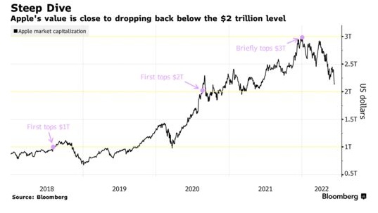 智通财经APP获悉,苹果(AAPL.US)的市值在今年1月超过3万亿美元之后,现在已减少了超过8000亿美元的市值。随着市场越来越担心美联储加息可能会使美国经济陷入衰退,苹果周二的市值降到了2.15万亿美元,相对于2万亿美元这条线显得岌岌可危。