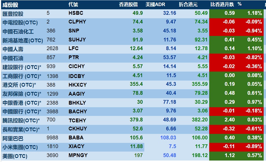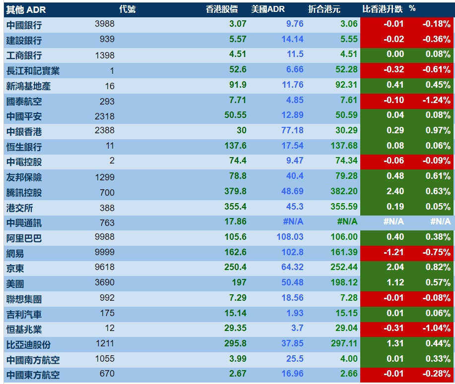 智通财经APP获悉,周三美股三大指数悉数上涨,港股ADR指数上涨,按比例计算,收报21386点,较香港收市涨78.00点或0.36%。