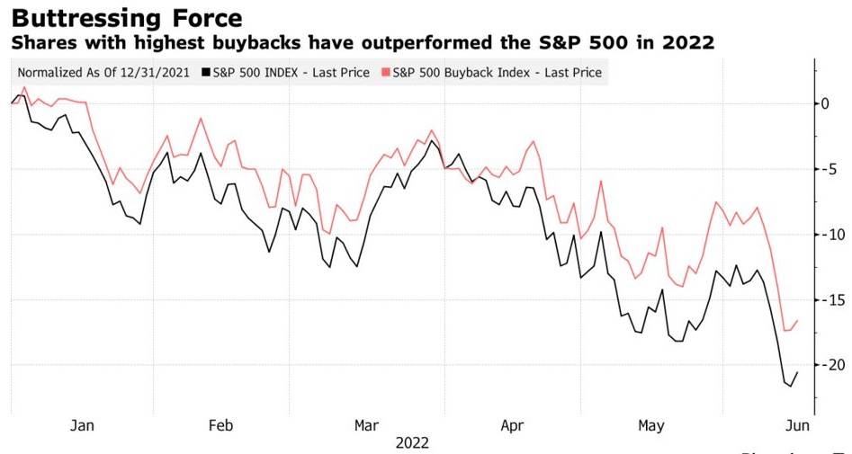 回购可以避免股票损失像滚雪球一样扩大。追踪回购率最高的100只股票的标普500股票回购指数今年以来下跌了16.5%,比整体基准指数表现好4个百分点。