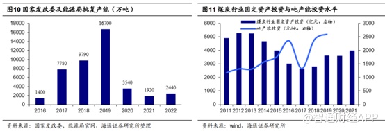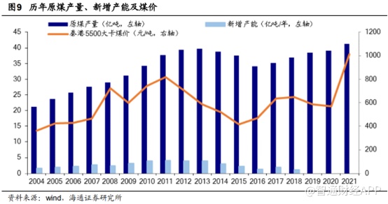 新增需求方面,一般来说煤炭产量的提升主要依赖于新建煤矿的不断投资建设和投产。过去十多年以来,我国煤炭年新增产能总体上经历了由低到高再下降的过程,特别是2015年底供给侧改革之后,煤炭年新增产能回落到历史低位附近,叠加2020年9月习总书记提出“3060”双碳目标,新建煤矿投资意愿愈加减弱。但煤炭产量在经历了2014-2016年的短暂回落之后,迅速开启了反弹,2021年创下历史新高。煤矿新增产能的减少和产量的不断增加,使得煤炭供给格局愈发偏紧,煤价中枢不断攀升。海通证券预计,“十四五”期间煤炭供需整体维持偏紧格局,煤炭价格中枢及盈利有望维持高位。
