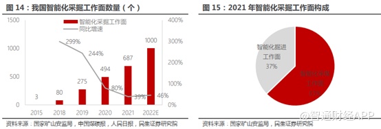 据《中国煤碳报》报道,截至2021年底,全国智能化采掘工作面已达687个,其中智能化采煤工作面431个,智能化掘进工作面256个。另据中国网2022年3月14日报道,安全基础司司长孙庆国在应急管理部3月例行新闻发布会上表示,全国智能化采掘工作面已达到813个,其中,采煤面为477个,掘进面为336个。按照煤矿安全专项整治三年行动实施方案,2022年要力争采掘智能化工作面达到1000个以上,有智能化的矿井产能达到10亿吨至15亿吨,建成一批100人以下少人智能化矿井。