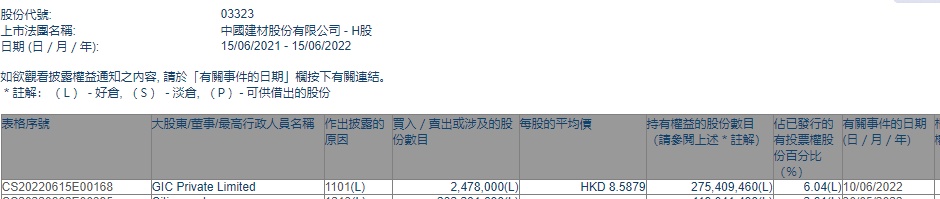 智通财经APP获悉,香港联交所最新资料显示,6月10日,GIC Private Limited增持中国建材(03323)247.80万股,每股作价8.5879港元,总金额约为2128.08万港元。增持后最新持股数目约为2.75亿股,最新持股比例为6.04%。