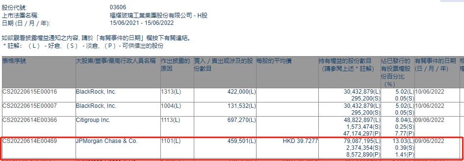 智通财经APP获悉,香港联交所最新资料显示,6月9日,小摩增持福耀玻璃(03606)45.9501万股,每股作价39.7277港元,总金额约为1825.49万港元。增持后其持股数目约为7908.72万股,最新持股比例为13.03%。
