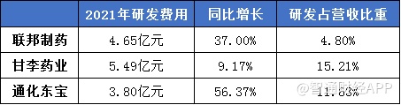 2021年,联邦制药的研发费用为4.65亿元,同比增长37.0%,占同期营业收入的4.8%。与同业竞争对手甘李药业、通化东宝相比,其研发占营收比重略显单薄。