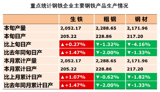 根据重点统计钢铁企业的产量进行估算,本旬全国共生产粗钢3131.80万吨、生铁2637.32万吨、钢材3957.35万吨。其中本旬全国日产粗钢313.18万吨、环比下降1.05%,日产生铁263.73万吨、环比增长0.13%,日产钢材395.74万吨、环比下降0.78%。