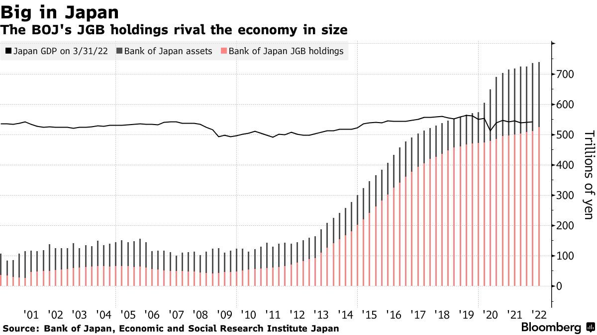 智通财经APP了解到,由于日本央行在面临通缩的日本持续寻求提振物价,该央行现在拥有526万亿日元(约4万亿美元)政府债券,几乎是总发行政府债券规模的一半,与日本经济规模相当。随着越来越多的投资者质疑日本央行的超宽松立场还能坚持多久,交易员们将密切关注日本央行将于本周五宣布的最新货币政策以及日本央行行长黑田东彦的言论。