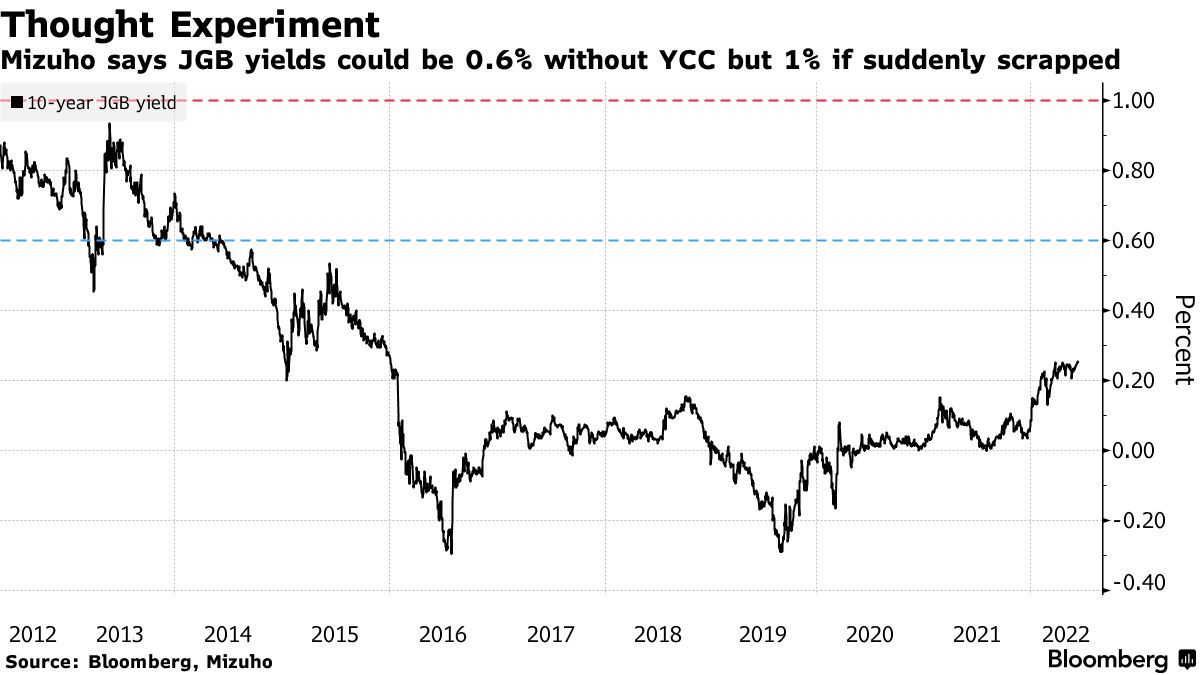 瑞穗表示,如果没有收益率曲线控制措施(YCC),日本国债收益率可能是0.6%,但如果突然取消,收益率可能是1%