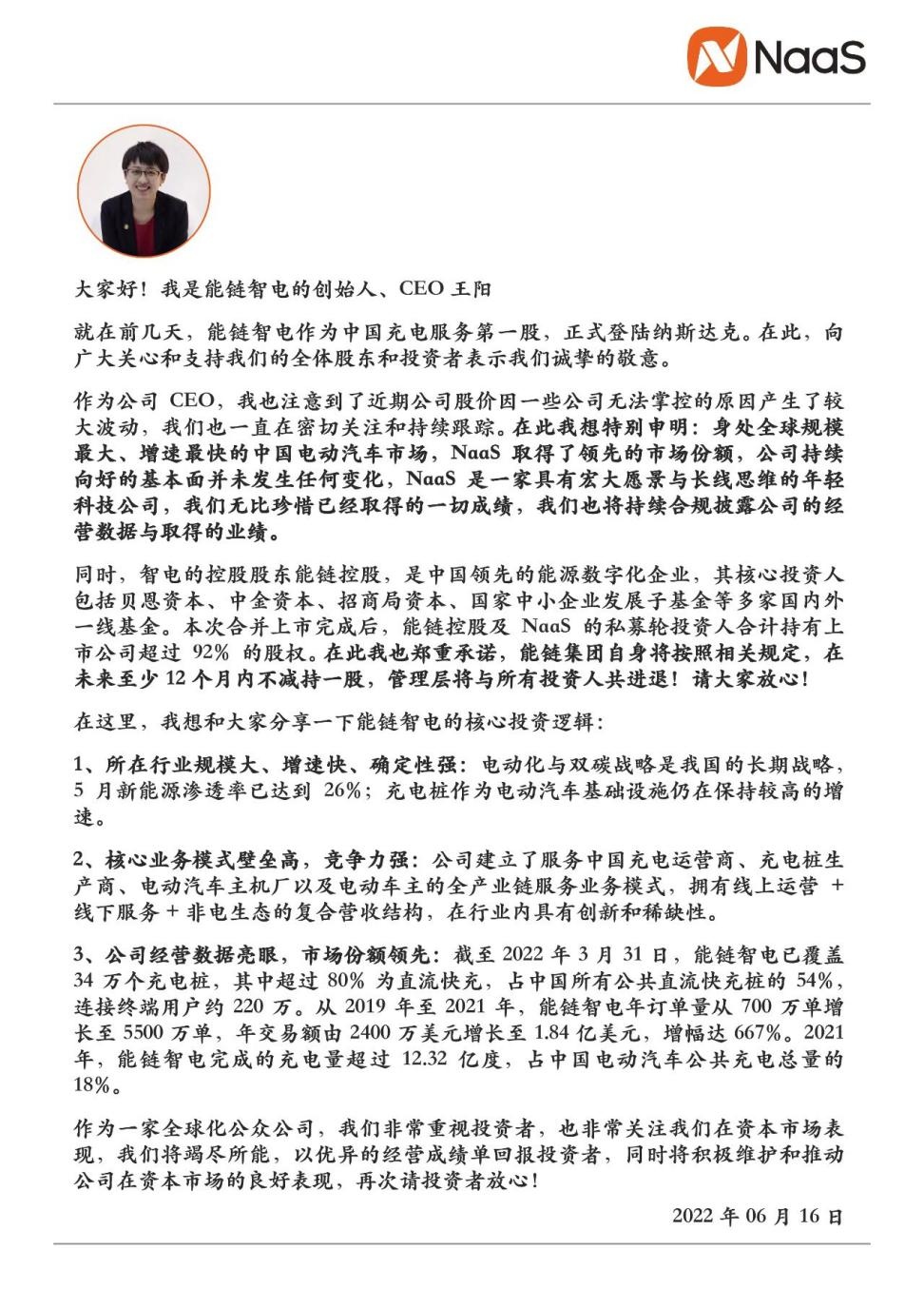 智通财经APP获悉,6月16日,在纳斯达克正式进行交易三天后,能链智电(NAAS.US)创始人、CEO王阳发表一封面对投资人的的公开信。王阳称注意到近期股价的波动,其强调,能链智电的控股控东能链控股及NaaS的私募轮投资人合计持有上市公司超过92%的股权。能链集团“承诺在未来至少12个月内不减持一股”。公司也称,将积极推动公司资本市场表现,以优异经营成绩单回报投资者。