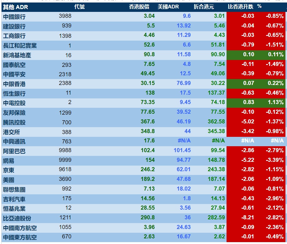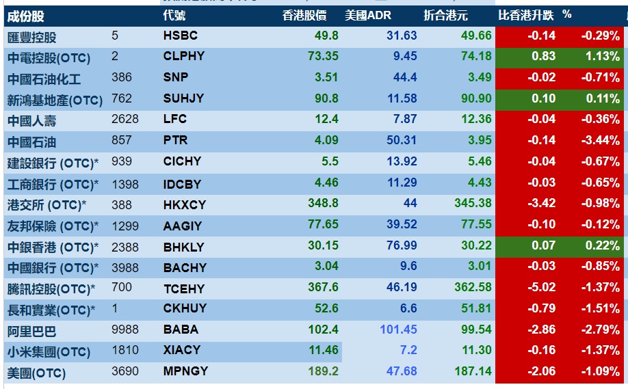智通财经APP获悉,周四美股三大指数悉数下跌,港股ADR指数下跌,按比例计算,收报20671点,较香港收市跌173.77点或0.84%。