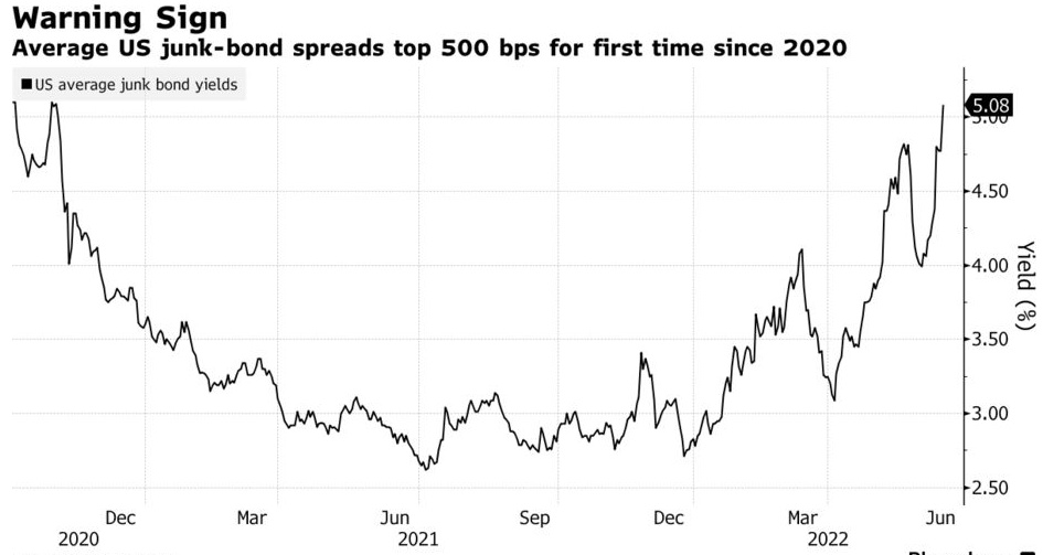 彭博美国企业高收益指数显示,这一数据周四上升31个基点,至508个基点。该数据衡量的是投资者为持有非美国国债所需要的额外收益率。过去两周,垃圾债券利差飙升100个基点,因美联储抑制通胀的努力加剧了市场对该央行将把美国经济推入衰退的担忧。