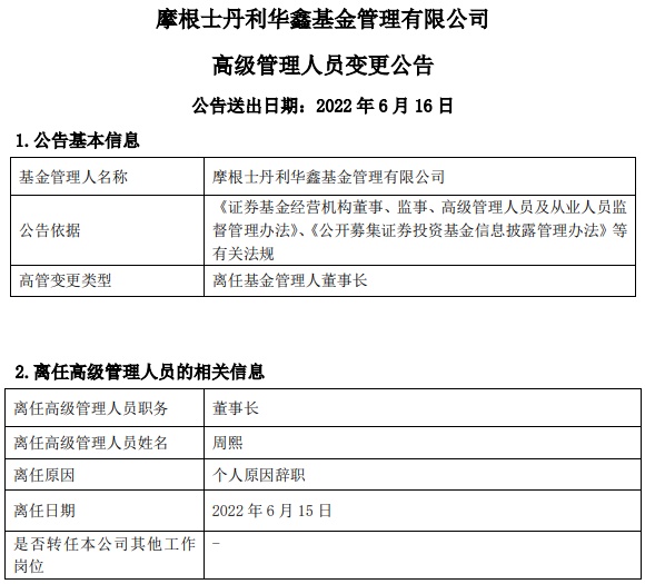 智通财经APP获悉,6月16日,摩根士丹利华鑫基金管理有限公司董事长周熙因个人原因辞职,离任日期为6月15日。