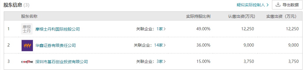 Wind数据显示,摩根士丹利华鑫基金成立于2003年3月,注册资本2.5亿元。摩根士丹利国际控股公司持有该基金公司49%股权,华鑫证券有限责任公司和深圳市基石创业投资有限公司分别持股36%、15%。