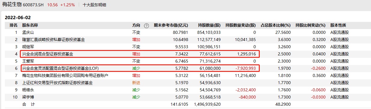 而在梅花生物(600873.SH)的基金持股变动情况方面,5月21日至6月2日的短短9个交易日内,谢治宇旗下的2只基金分别减持了该公司约232万股和172万股。6月7日,梅花生物发布的公司股东公告显示,截至6月2日,兴证全球基金副总经理谢治宇管理的兴全合润基金持有该公司7761.26万股,他管理的另一只基金兴全合宜持有该公司6108万股。而梅花生物在5月22日发布的股东公告显示,截至5月20日,兴全合润持有该公司7993.57万股,兴全合宜持有该公司6280.07万股。