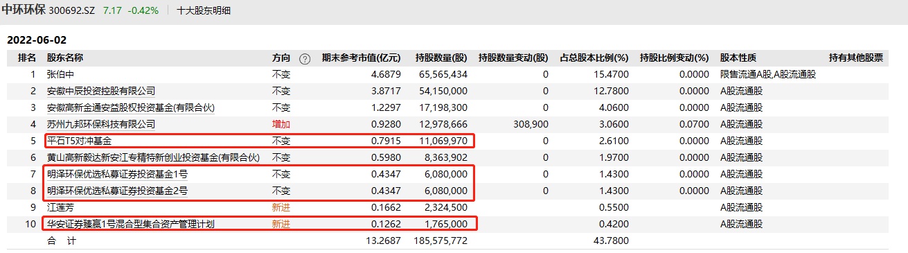 而一季度末以来,中环环保(300692.SZ)的机构股东持股情况总体稳定。公告显示,截至6月2日,平石T5对冲基金、明泽环保优选私募证券投资基金2号、明泽环保优选私募证券投资基金1号、华安证券臻赢1号混合型集合资产管理计划分别持有1106.997股、608万股、608万股、176.5万股公司股份。不过,一季度末持有376.96万股的上海漓沁资产管理合伙企业(有限合伙)掉出了前十大流通股东名单,而当时持有186.17万股的华安证券臻赢2号混合型集合资产管理计划的替代者则是持有176.5万股的华安证券臻赢1号混合型集合资产管理计划。