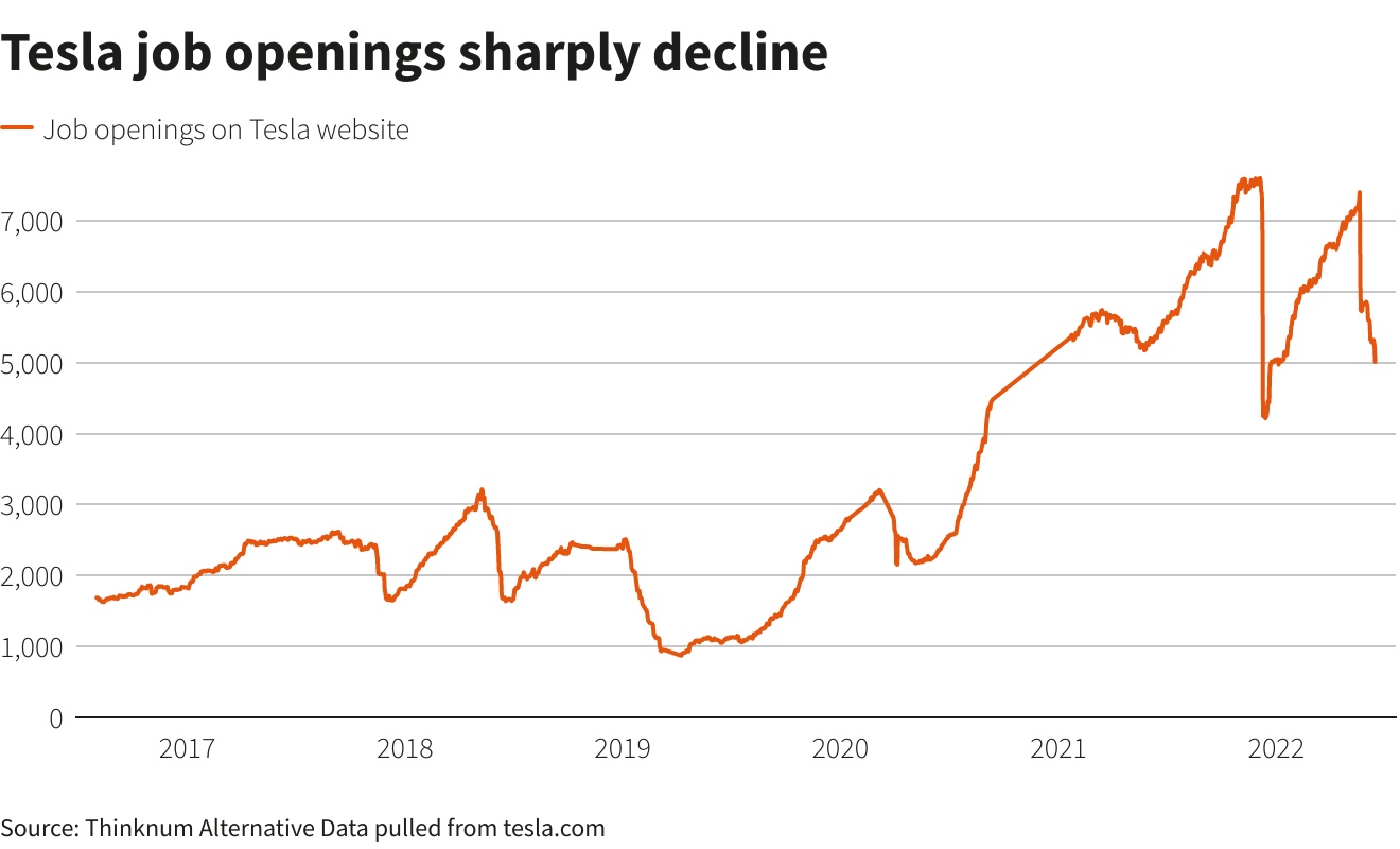 Thinknum Alternative data的数据显示,特斯拉网站上的职位列表数量从本月初的5855个下降到5011个,更是较5月21日的近期高位下降了32%。在市场萎缩、通胀表示、对经济衰退的担忧蔓延之际,特斯拉这一举动是一个令人担忧的迹象,表明全球经济健康状况并不乐观。