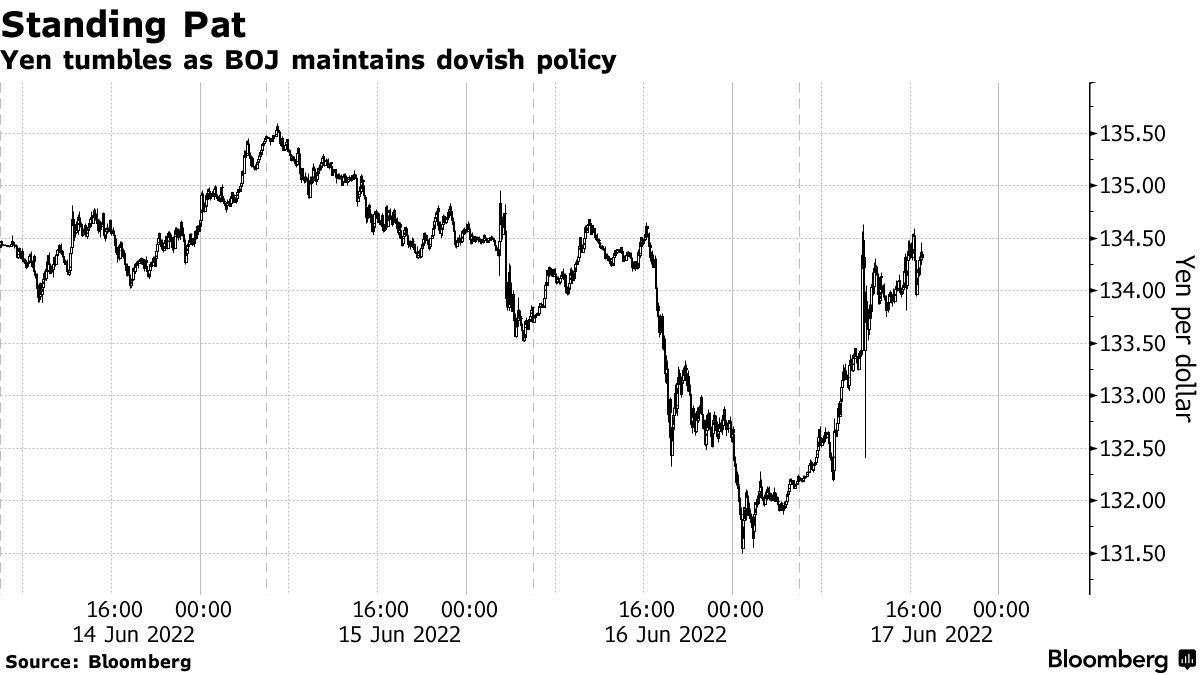 在本周早些时候遭受重创后,日元获得了一些支撑,原因是美联储的决定引发了人们对美国可能陷入衰退的担忧,进而支撑具有避险属性的日元。在日本央行公布利率决议后日元汇率波动幅度加大,但目前还没有达到空头们135-140的预期,美元兑日元比例在1%-1.8%升幅之间反复来回,截至发稿美元兑日元涨1.70%至134.45日元。