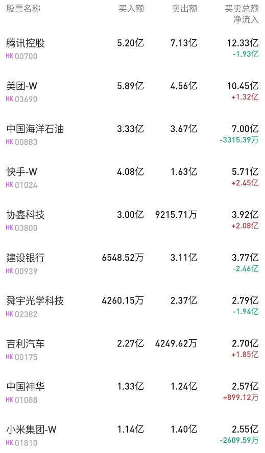 此外,中海油(00883)、中国移动(00941)、中国神华(01088)分别获净买入2.97亿、1.34亿、899万港元。而建设银行(00939)、腾讯(00700)分别遭净卖出2.45亿港元。