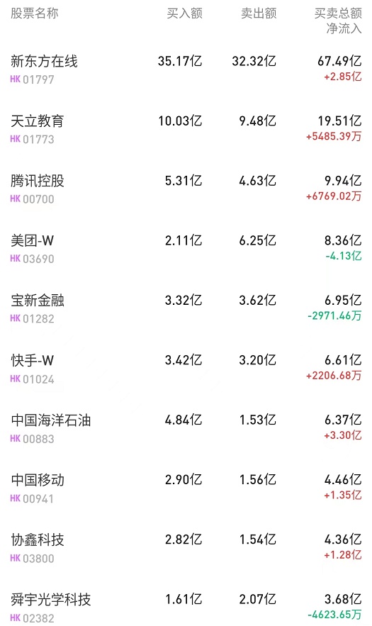 新东方在线(01797)获净买入2.84亿港元,本周累计净买入额约13.48亿港元。消息面上,天风证券表示,从东方甄选近几日GMV及粉丝增长看,目前保守预期稳态日均GMV3000万左右,年GMV或在100亿左右,考虑到自带流量及资源倾斜、自有品牌占比提升等,净利率或在5%左右,预计年净利为5-7亿,同时中长期成长空间广阔,原有大学考研四六级等业务加速发展,贡献持续现金流及稳定业绩。