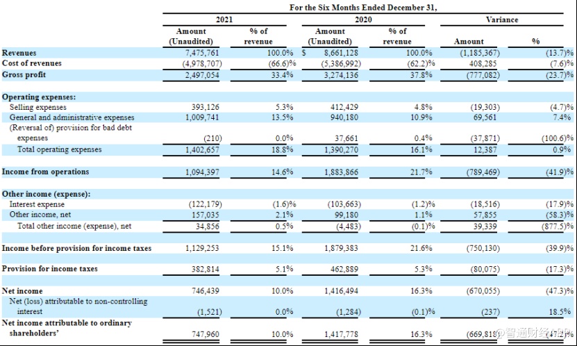 数据显示,利邦厨具在2020财年、2021财年的营业收入分别为866.1万、747.6万美元,2021财年公司收入同比下滑13.7%;相应的净利润分别为141.6万、74.6万美元,当期净利润较2020财年同期下滑47.3%。