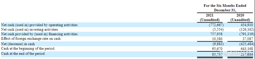 由于2021财年业务发展的不景气以及回账带来的压力,导致利邦厨具的收现情况出现一定恶化。公司当期经营活动现金流净额从上年同期的净流入转为净流出77.3万美元。