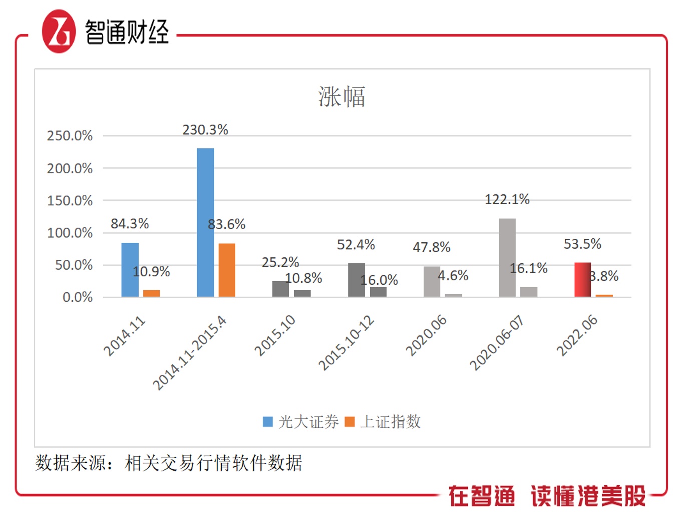 智通财经APP了解到,光大证券(06178)A股历史上每次启动都带动大盘上涨,且持续时间2个月以上。以近该公司近三次为例,2014年11月启动,半年涨幅达230.3%,带动大盘涨幅83.6%;2015年10月启动,3个月涨幅52.4%,带动大盘涨幅16%;2020年6月启动,两个月涨幅122.1%,带动大盘涨幅16.1%。