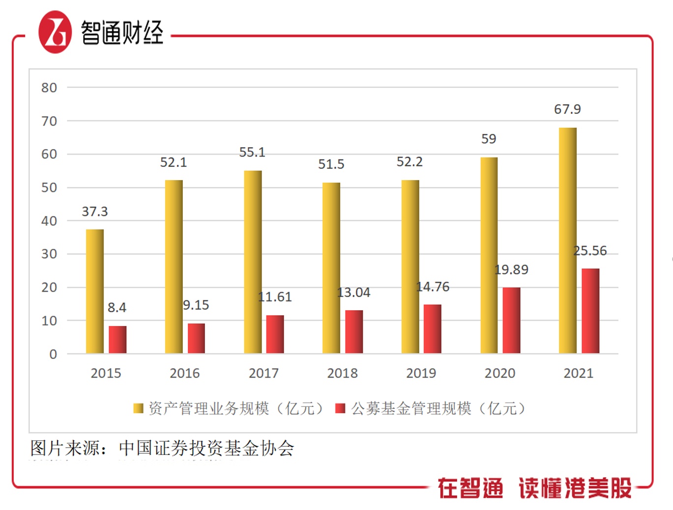 财富管理行业是券商长期转型的方向,行业趋势分工将更加明确,公募及私募管理资产持续提升,为券商代销业务带来业绩增量。根据中国证券投资基金协会数据,2021年,资产管理业务产品规模67.9万亿元,公募基金管理规模25.56亿元,2015年以来复合增长率分别为10.5%及20.4%。