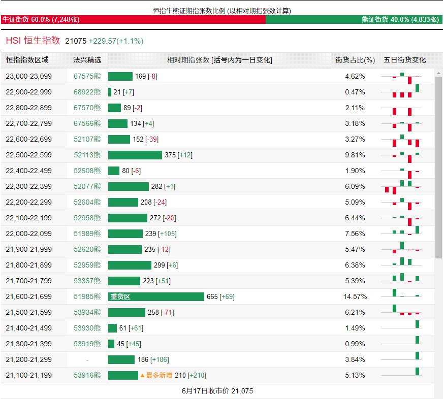 智通财经APP获悉,截至6月17日,恒指最新的牛熊街货比例为60:40。