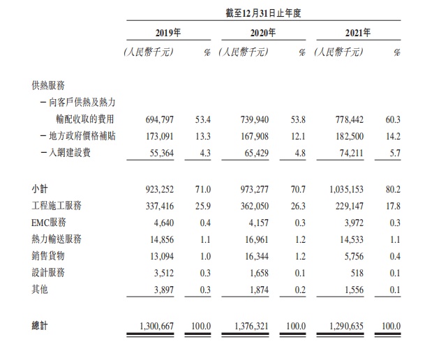 分业务而言,慧居科技的供热服务所得收入(包括向客户供热及热力输配收取的费用、地方政府价格补贴及入网建设费)分别约为9.23亿元、9.73亿元及10.35亿元,分别占总收入的71.0%、70.7%及80.2%,是其营收主力。工程施工服务所得收入分别约为3.37亿元、3.62亿元及2.29亿元,分别占总收入的25.9%、26.3%及17.8%;EMC服务所得收入分别约为460万元、420万元及400万元,占总收入的0.4%、0.3%及0.3%。简言之,该公司的大部分收入来自提供与五项特许经营权(均为BOT合同)有关的供热服务,且该业务的营收规模越来越大。