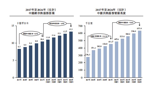 根据弗若斯特沙利文报告,中国的总供热服务面积(按建筑面积计)从2017年的83亿平方米增加至2021年的104亿平方米。预计该面积于2026年将增加至133亿平方米,2021年至2026年的复合年增长率为4.9%。该增长与秦岭-淮河以南地区对供热服务的需求增加不无关系。
