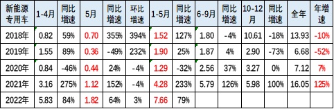 新能源专用车2021年市场销量16.05万台,同比增长125%;2022年5月的新能源专用车市场销量1.82万台,同比增长64%。2022年1-5月达到7.66万台,同比增长79%,增速较强。