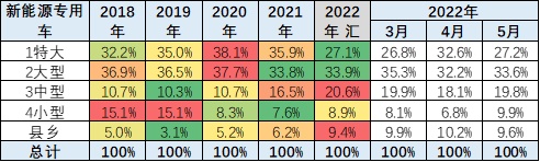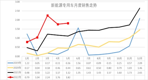 2022年5月的新能源专用车市场销量1.82万台,同比增长64%。2022年1-5月达到7.66万台,同比增长79%,增速较强,实现倍增的增速水平。目前看,今年新能源专用车走势将大幅超强于传统轻型车市场。