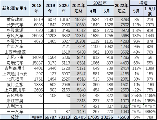 2022年的新能源专用车市场总体看没有特别的强势厂家,奇瑞等全国性的优势企业不多,专用车与乘用车的竞争格局明显差异。