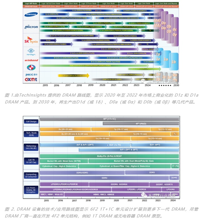 图 1 显示了来自三星, 美光, SK海力士,Nanya, PSMC, and CXMT厂商的 DRAM 路线图。三星、美光和 SK海力士三大厂商已经展示了适用于 DDR4、DDR5 和 LPDDR5 应用的具有 15nm 和 14nm 级单元设计规则 (D/R) 的 D1z 和 D1a 产品。三星已在 D1x DDR4 试用车(TV) 产品和 D1z LPDDR量产产品中采用 EUV 光刻技术,而美光和 SK 海力士则为 D1z 代保留了基于 ArF-i 的双图案化技术 (DPT) 工艺。到 2030 年,将生产出D1d(或 1δ)、D0a(或 0α)和 D0b(或 0β)等设计进一步缩小的几代 DRAM。另一家来自中国的 DRAM 制造商长鑫存储也加入了竞争,今年正在开发D1y 代。