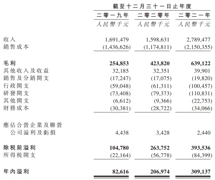于2019年、2020年、2021年,武汉有机控股收入分别为约16.915亿元、15.986亿元、27.895亿元人民币;同期,年内溢利分别为8261.6万元、2.070亿元、3.091亿元人民币。