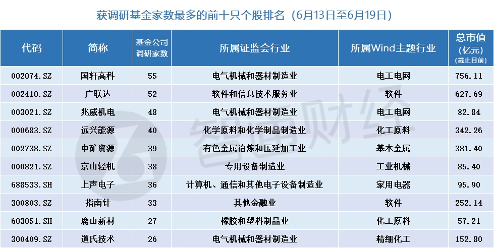 6月第三周,国轩高科(002074.SZ)获基金公司调研家数最多,共有55家基金公司在一周内调研该公司,较第二周“登顶榜首”、获44家基金公司调研的伟星新材(002372.SZ)高出11家。