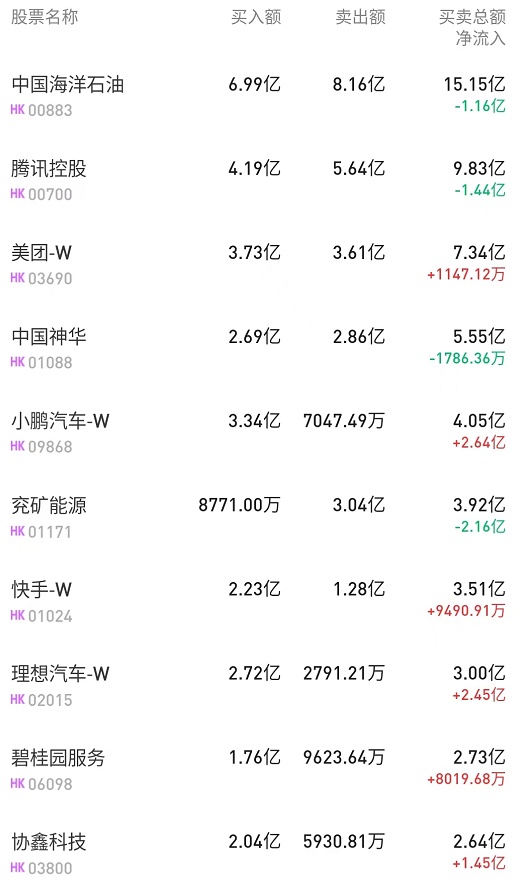 北水净买入最多的个股是小鹏汽车-W(09868)、理想汽车-W(02015)、协鑫科技(03800)。北水净卖出最多的个股是中海油(00883)、腾讯(00700)、兖矿能源(01171)。