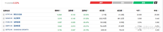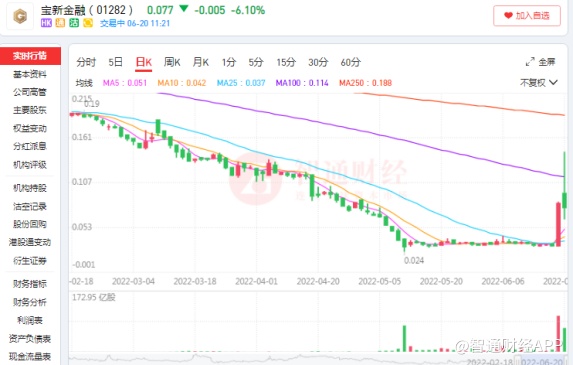 不过,暴涨背后,股价目前已有所回落。6月20日,宝新金融盘中跌超20%,成交量为96.63亿,截至发稿,成交量在港股中排名第一,跌幅在港股中排名第三。