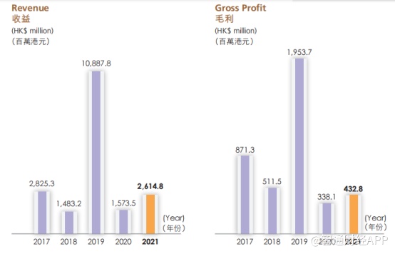 金融服务业务则在2021年遭遇营收大幅下滑,从2020年的2.47亿港元下滑约58.4%至1.03亿港元,营收占比从15.7%跌至3.9%,经营亏损约1.82亿港元。其中,证券投资业务在2021年有小幅增长,营收从2200万港元增长至4960万港元,在总营收中占比仅为1.9%。
