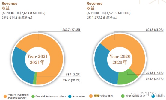 从业务结构来看,驱动业绩增长的主要为物业业务和自动化业务。其中,物业投资与发展业务收入17.68亿港元,营收占比从2020年的51%增长至67.6%,产生利润为0.98亿港元,整体扭亏为盈。