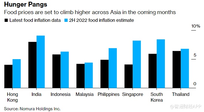 这对新加坡等食品进口国来说是一个警告信号。预计新加坡今年下半年的食品通胀将从目前的4.1%翻番至8.2%。据野村证券估计,由于原材料成本上升,印度可能出现9.1%的最高增幅。