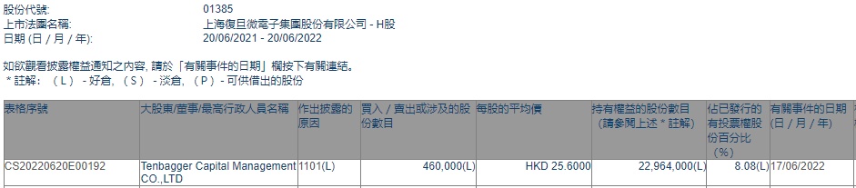 智通财经APP获悉,香港联交所最新资料显示,6月17日,Tenbagger Capital Management增持上海复旦(01385)46万股,每股作价25.60港元,总金额为1177.6万港元。增持后最新持股数目约为2296.4万股,最新持股比例为8.08%。