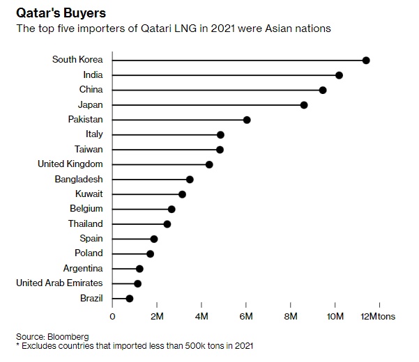 这一项目将使卡塔尔的液化天然气年产量从7700万吨增加到1.1亿吨,目前全球对于天然气的需求正在激增,尤其是在欧洲。自乌俄冲突加剧以来,买家们都在争相获得来自非俄罗斯的能源供应。