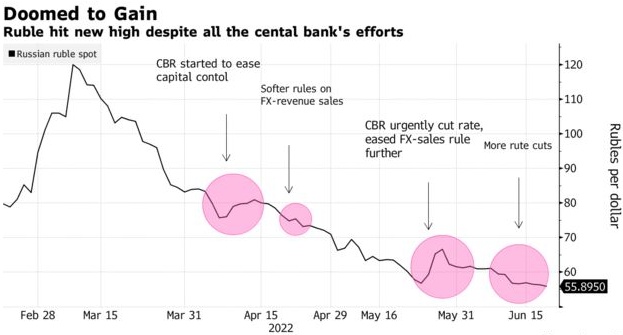 虽然上述措施帮助俄罗斯避免了一场外汇危机,但它也让俄罗斯央行感到担忧,因为它削弱了以卢布计算的出口收入,并使俄罗斯商品在海外的价格更高。俄罗斯央行以一系列宽松措施作为回应。