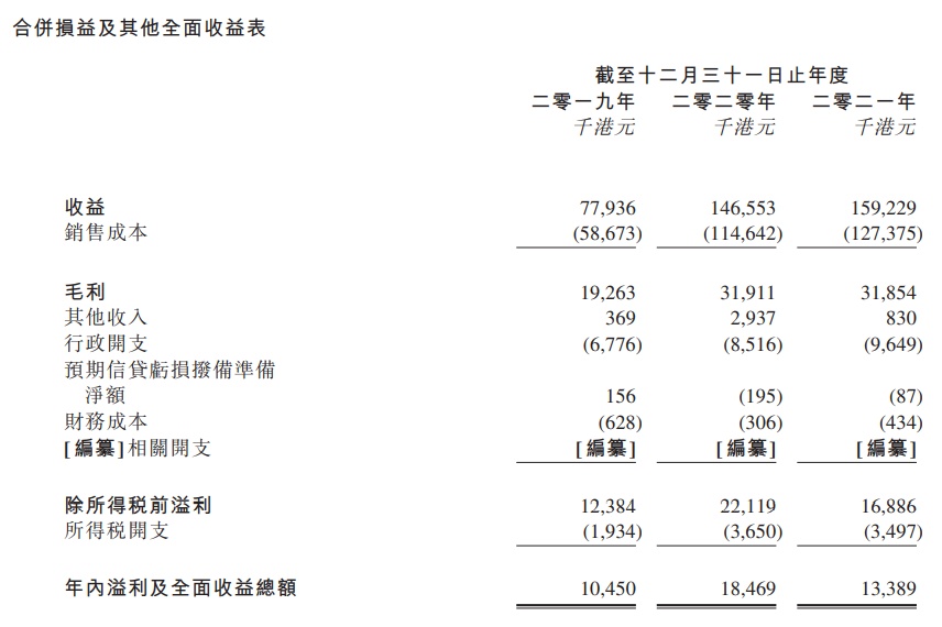 财务方面,截止2019、2020及2021年度,MCA Group收益分别为7793.6万港元、1.47亿港元及1.59亿港元;毛利分别为1926.3万港元、3191.1万港元及3185.4万港元;年内溢利分别为1045万港元、1846.9万港元及1338.9万港元。