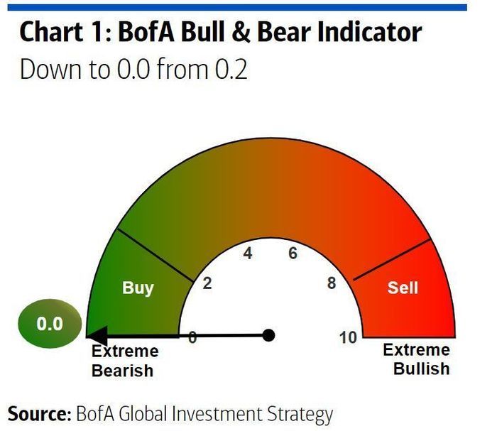 与此同时,美银的牛熊指标已跌至“反向看涨”区间。据悉,该指标是分析师常用来观察股票市场情绪的代表性指标,使用0-10的数值表示市场当前的气氛。当指标数值处于0-2区间,代表市场情绪过度悲观,这时候的股市可能已经超跌,投资人应该逢低布局;而当指标数值为8-10,则代表市场处于极度乐观的情况,股市可能已经超涨,投资人应观望或获利了结。